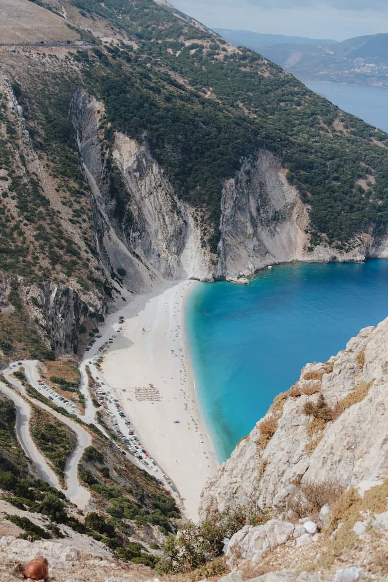 Myrtos Beach is one of the most photographed beaches in Greece, and the viewpoint on the side of the main road above it is a must‑stop. (Although take care with little ones as it is right next to the busy road and there are only low barriers between the viewpoint and the cliff edge.)