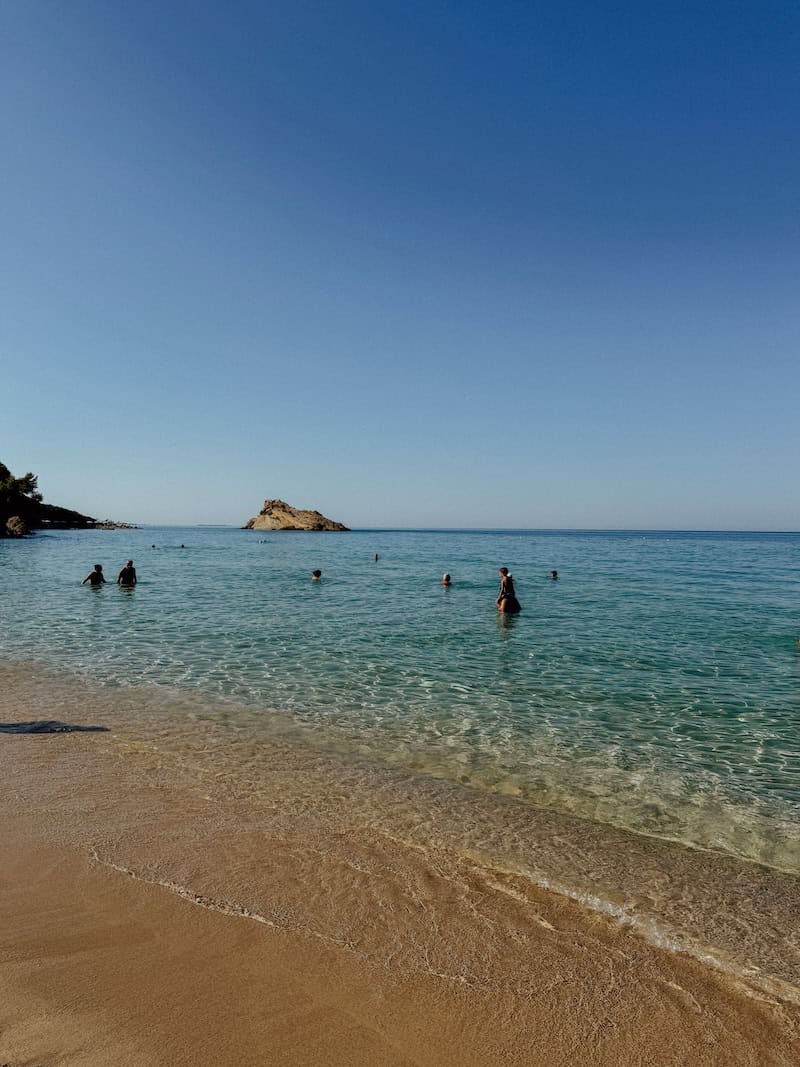 There are no facilities on Fteri Beach so bring your own snacks and water and take all rubbish away with you. I would also recommend a beach umbrella (the water taxi company lent us one!) as well as sea shoes because the beach is veryyy stony.