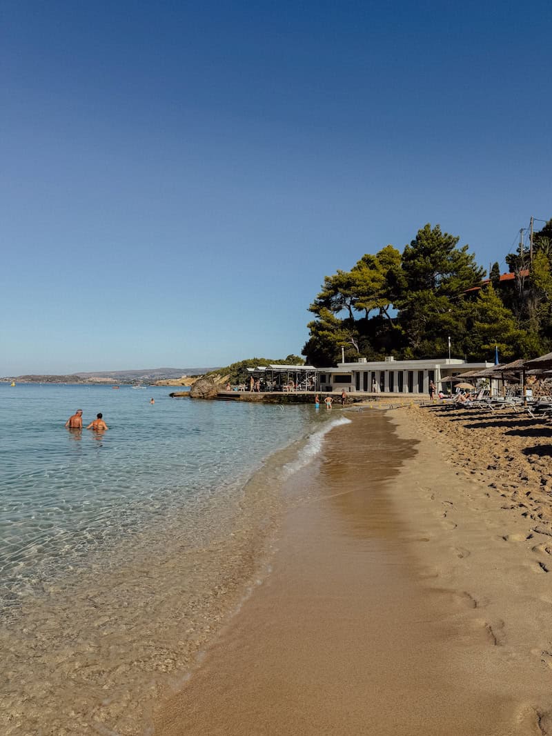 If you’d like more facilities and a bit more of a buzzing atmosphere, Costa Costa Beach Club on Makris Gialos – the next beach along – ticks all these boxes.